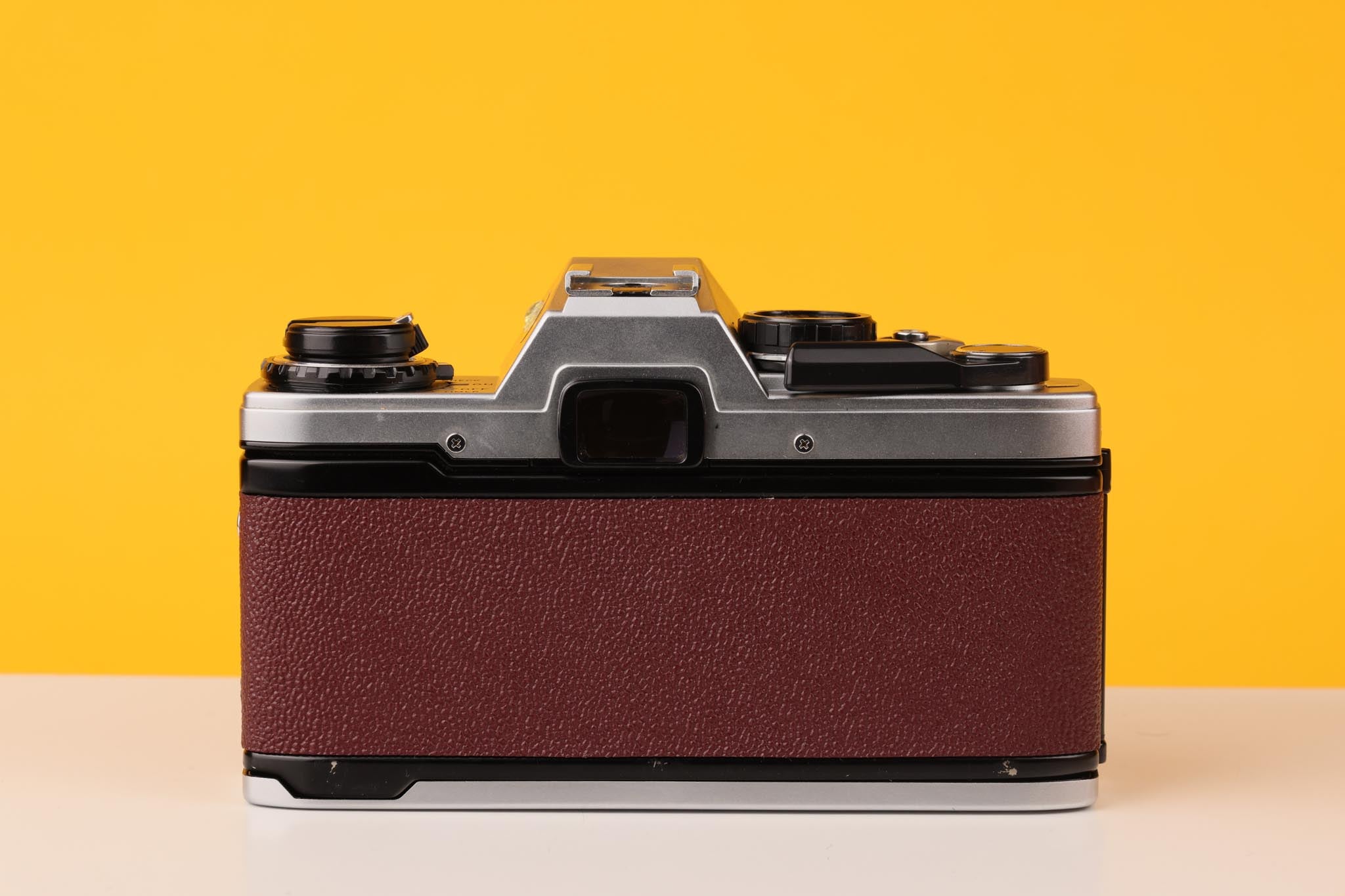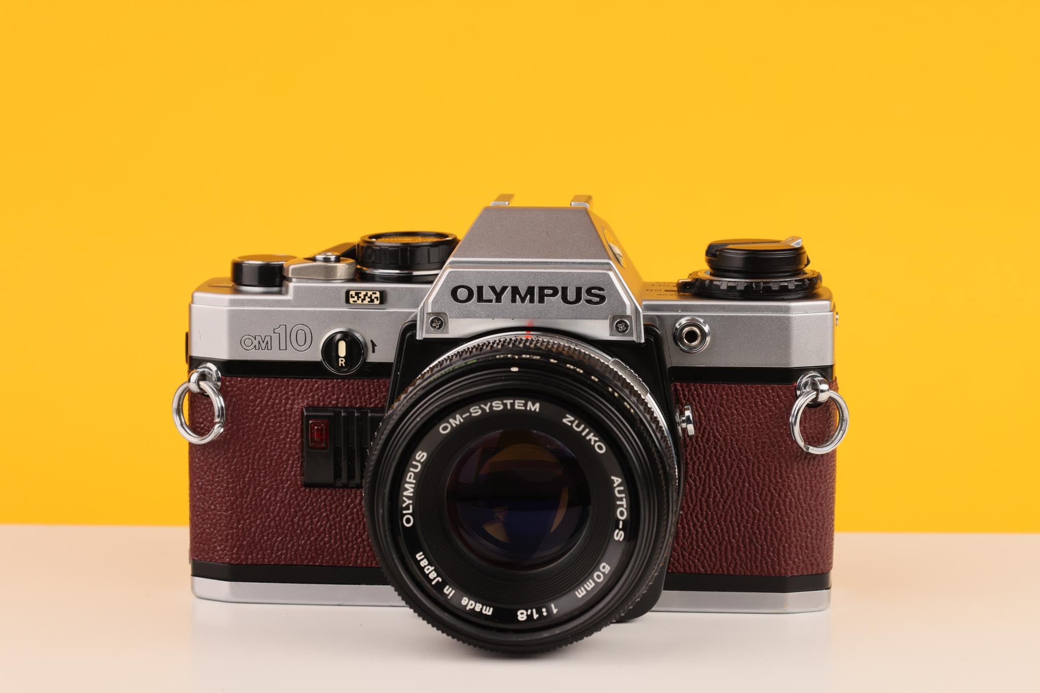 Olympus OM10 35mm Film Camera with Zuiko 50mm f1.8 Prime Lens Burgundi