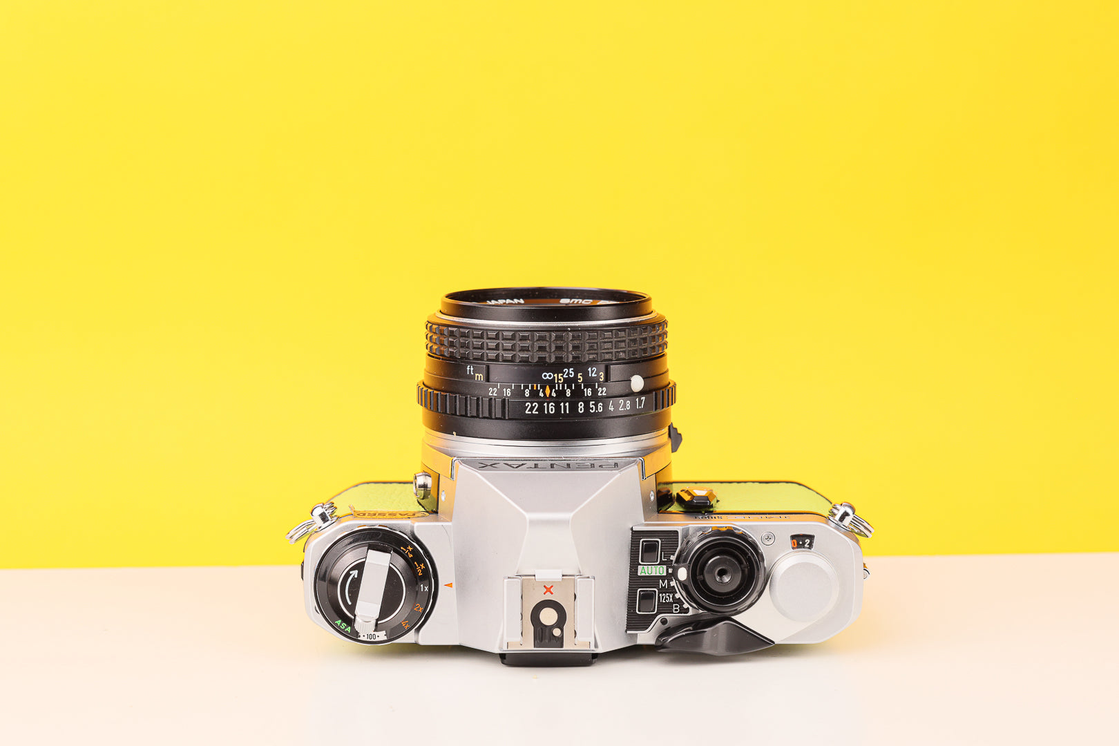 The hotshoe features an additional shoe contact for dedicated Pentax flash units, not seen on the preceding ME.