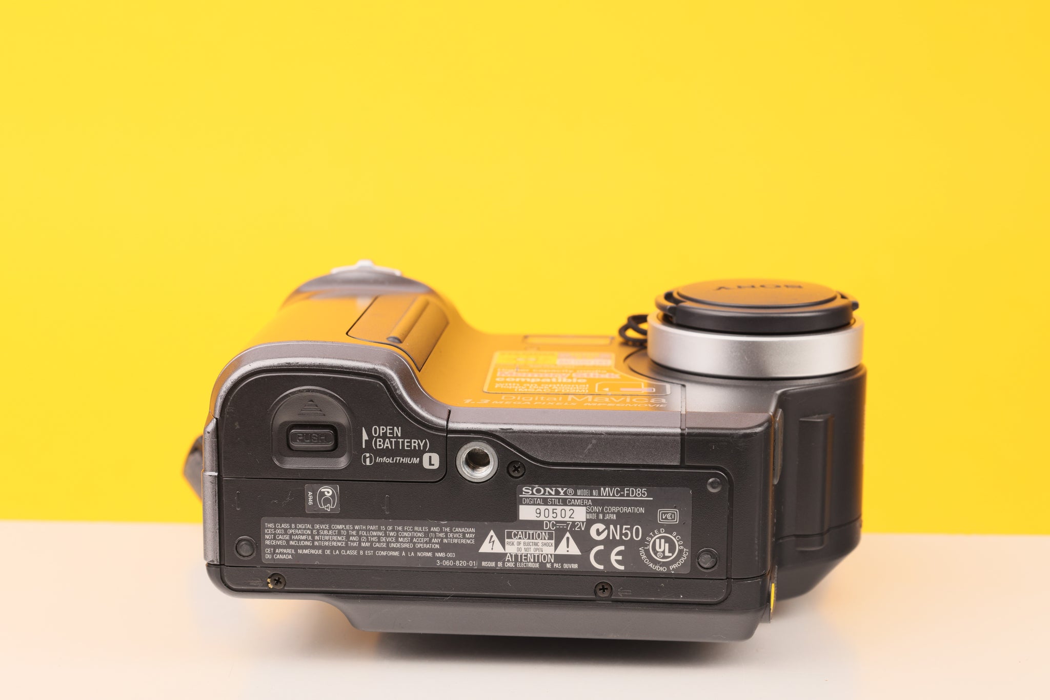 The MVC-FD85 is a digital camera introduced in 2000 (alongside the FD90) in the Mavica series from Sony. As with earlier Mavica models, a standard computer floppy disk is used for storage; or Sony's MSAC-FD2M "dummy floppy" adapter which accepts Memory Stick cards. The sensor resolution is 1280×960 pixels. At that 1.2-megapixel image size, a standard 1.4 MB floppy will hold approximately six images.