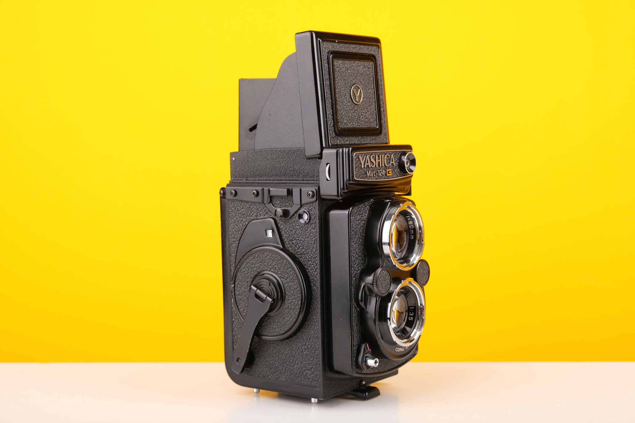 Has a four-element, 80mm f/3.5 taking lens. The Mat-124 and Mat-124 G (Yashica-12, 24) all accept Bay 1 accessories, such as those made for the Rolleiflex.